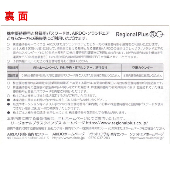AIRDO・ソラシドエア株主優待番号ご案内書(リージョナルプラスウイングス株主優待券)